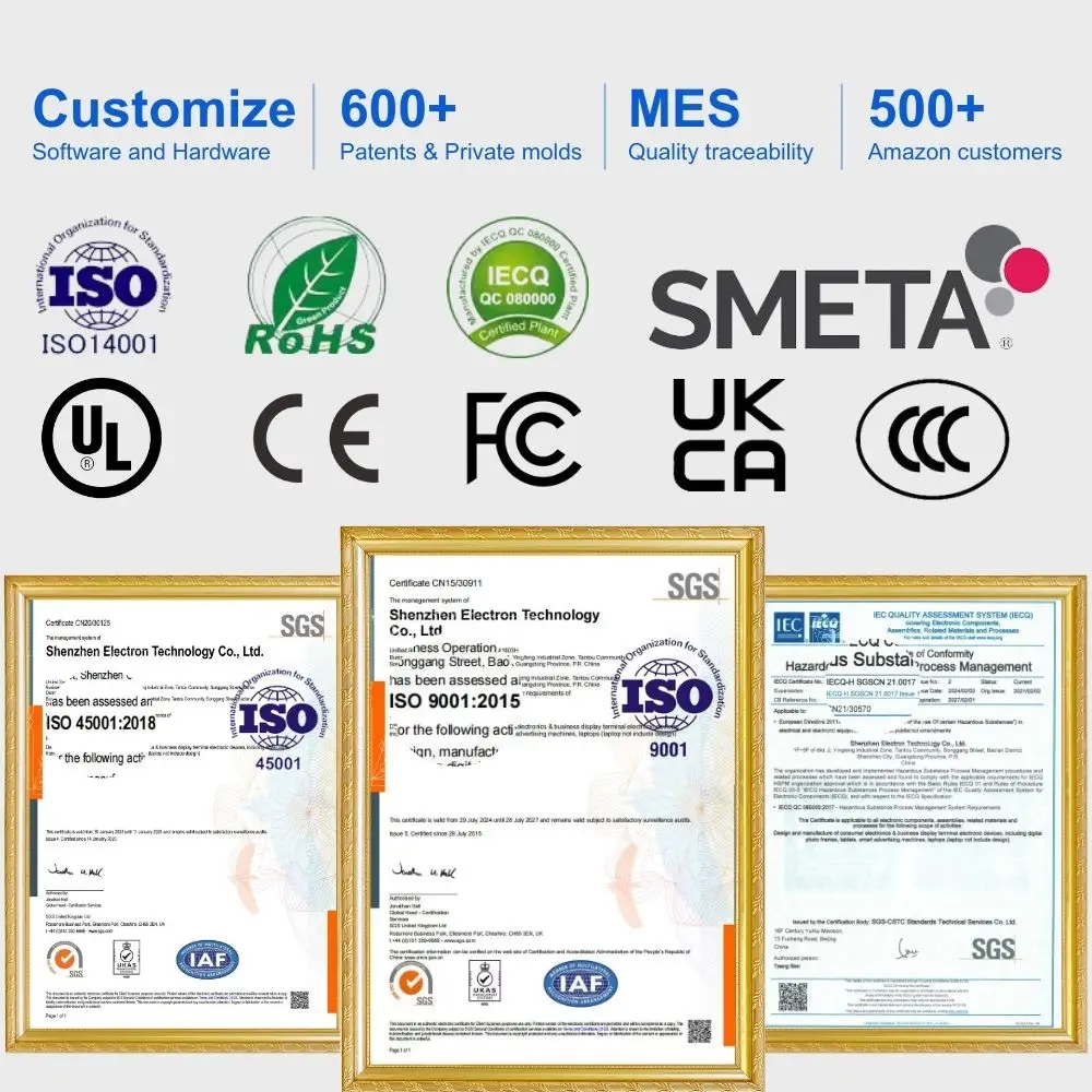 Shenzhen Electron Technology Co.. Ltd. is a factory-based enterprise with over 500 employees. specializing in touch screens. Android tablets. digital signage. and Android all-in-one PCs. We ship over 1 million units yearly to over 30 countries.